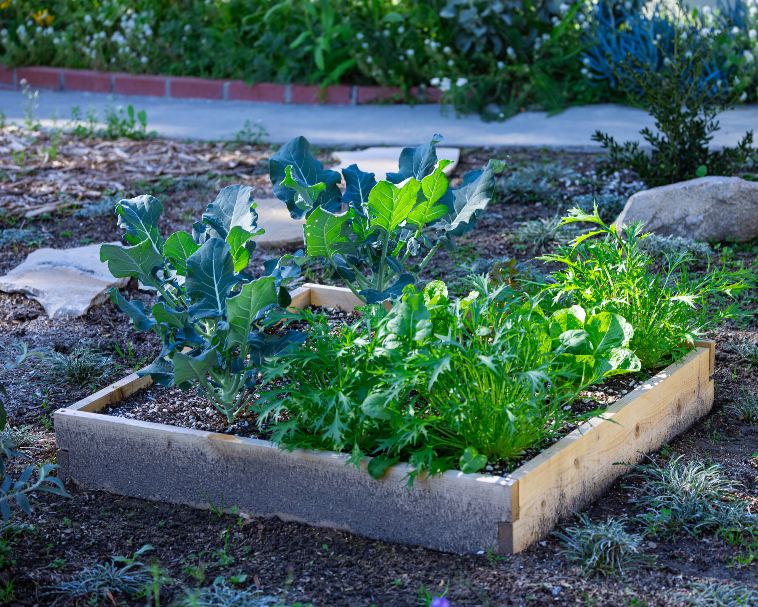 Brocolli, lettuce, and other salad greens make for a nice cool-season crop! This raised garden bed was installed last in the empty space that is shown in the first image of this section. The crops were planted from small plugs (6 pack size) roughly 1-2 months prior to this photo being taken. Nothing beats doing some edible gardening in the middle of a pollinator garden!