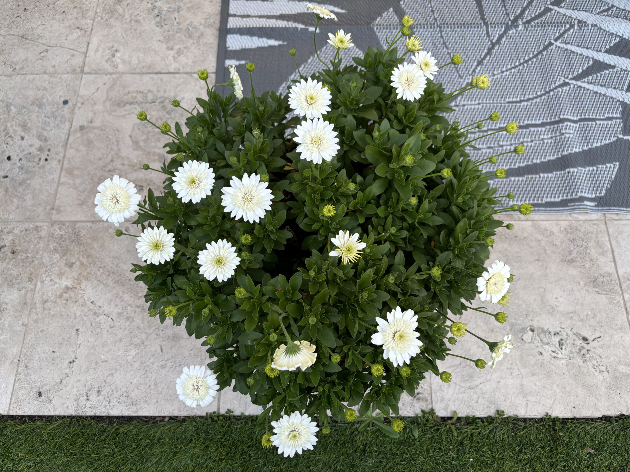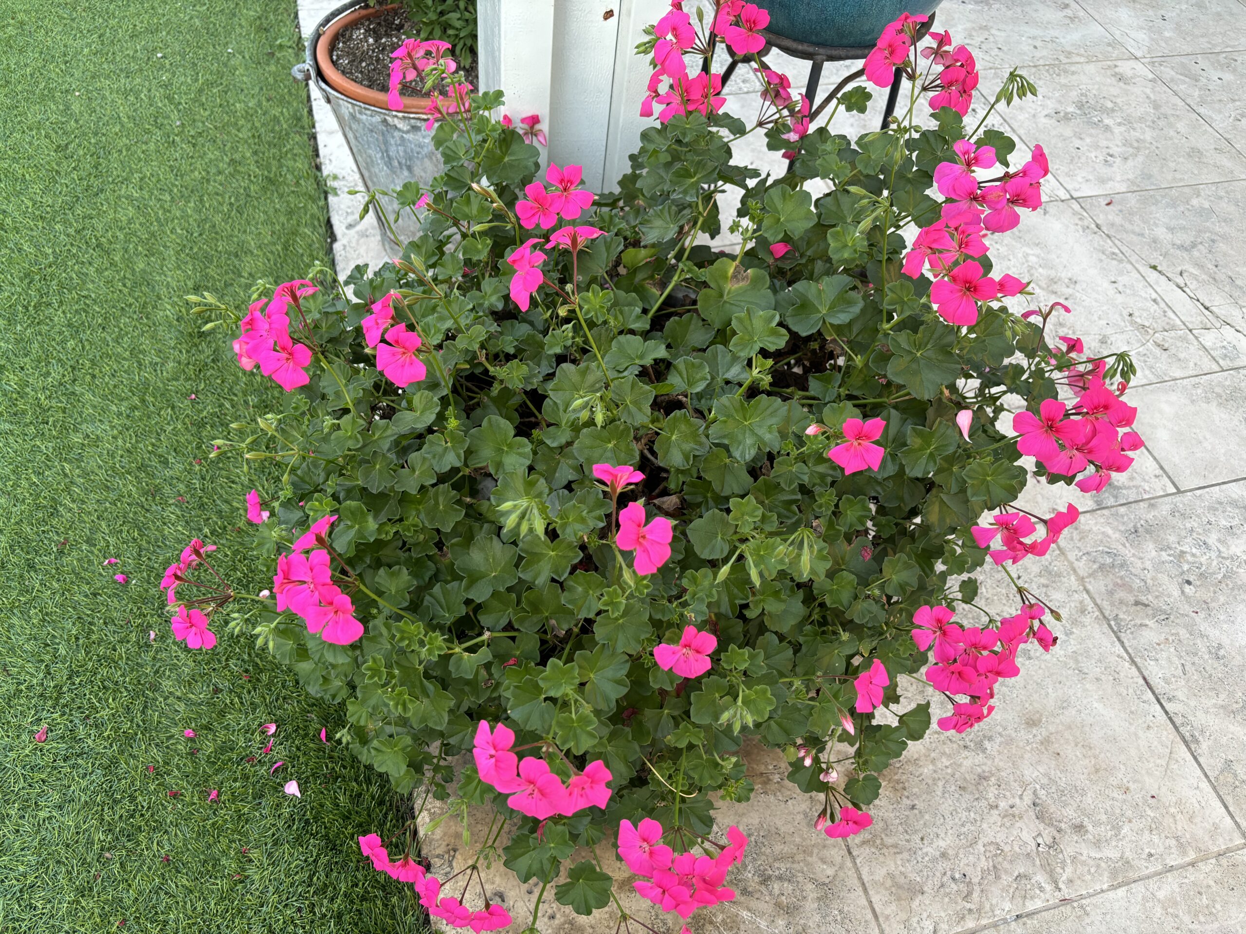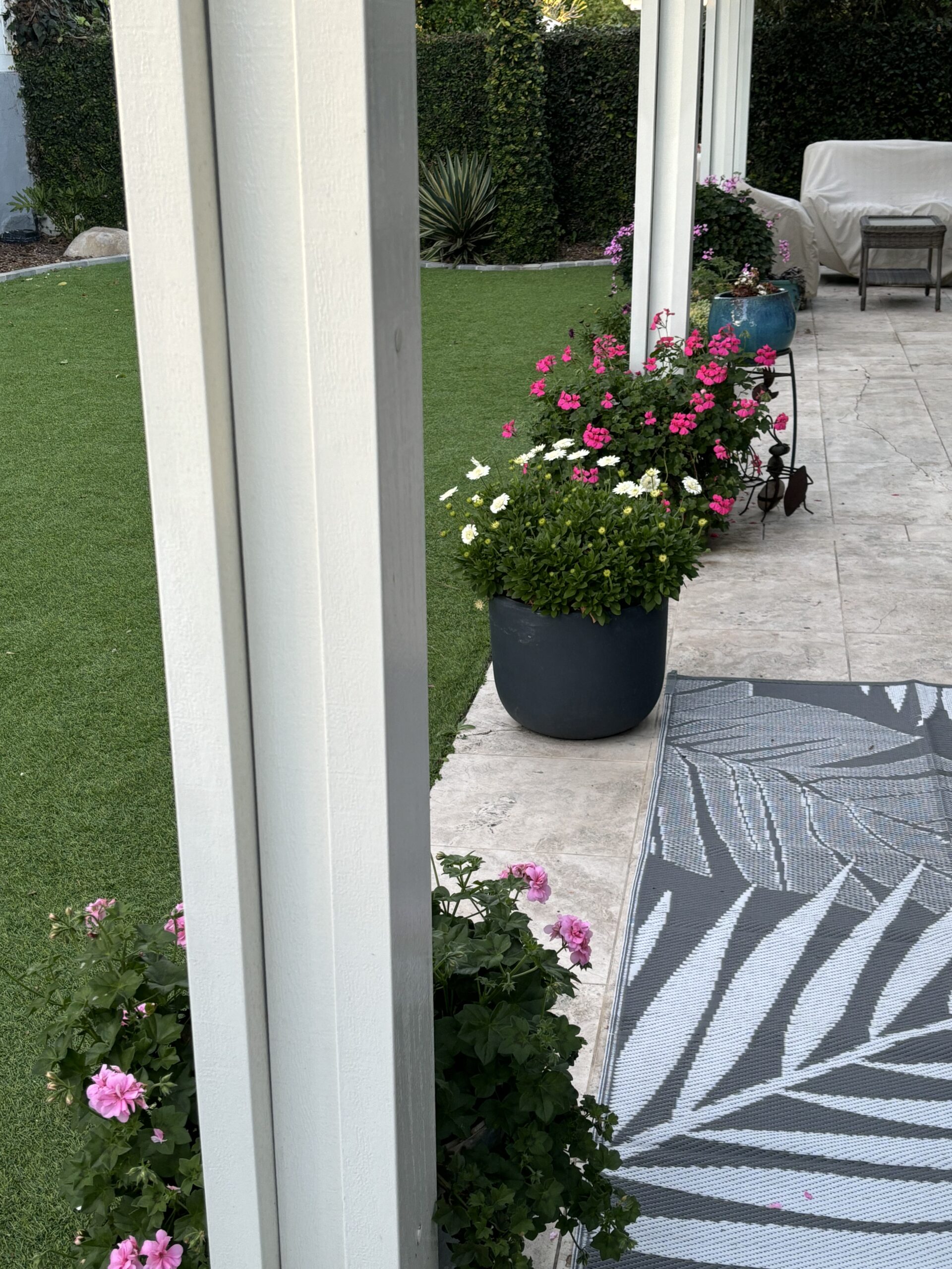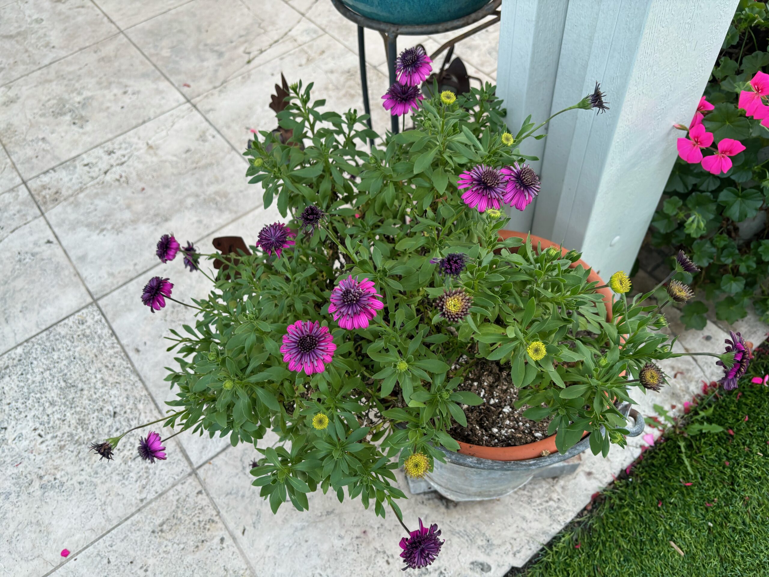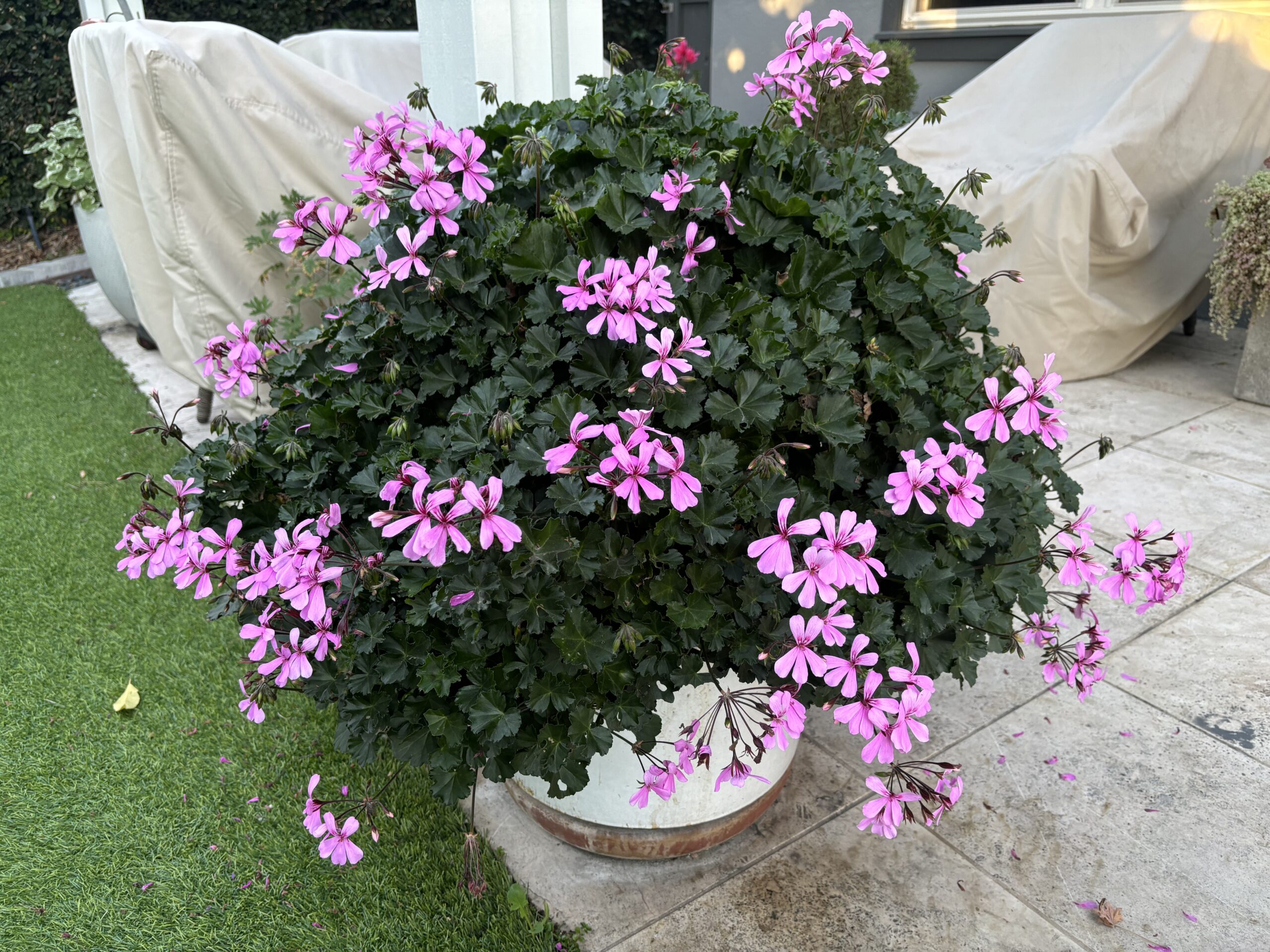 Zonal Geraniums, Ivy Geraniums, and African Daisies light up this backyard seating area. This picture was taken in Late January, and the plants are already in full bloom and thriving from regular maintenance.